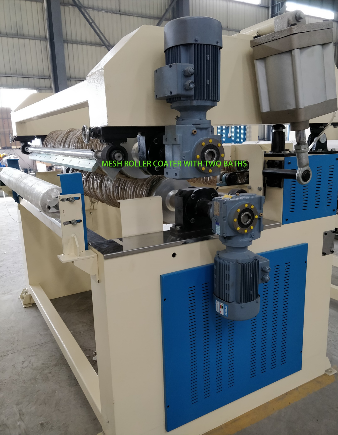 5. 2nd Coater 5.1 Main Features Wider range MESH ROLLER coating device: It equips with a set of glue scraper and automatic trimming blades. The top and bottom coating roller are driven by two independent deceleration motors, each motor is 1.1kw. VVVF controls line speed of the coating rollers. smooth and leveling device consists of 4 chrome‐plated roller and telescopic cylinder. Nos 4 smoothing rollers are divided into the upper and lower groups, driven by two sets of 0.75kw deceleration motor in VVVF method. The telescopic cylinder can separate the smooth roller device, for easy cleaning and overhaul.