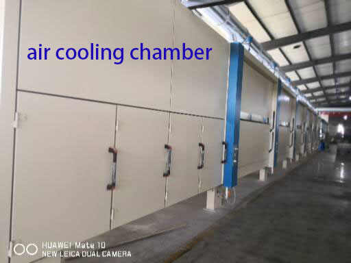 7. 2nd Cooler 7.1 Main Features 2nd cooling chamber section as 3Meter, adopted one 3kw centrifugal motor. Each cooling zone is composed of a top and bottom air chest, blower connecting pipe and a blower fan. Upper and down Air nozzles equalized in same distance. Two pieces of side‐door of the cooling chamber is easy inspection and cleaning. Autolocking knob can be firmly closed.