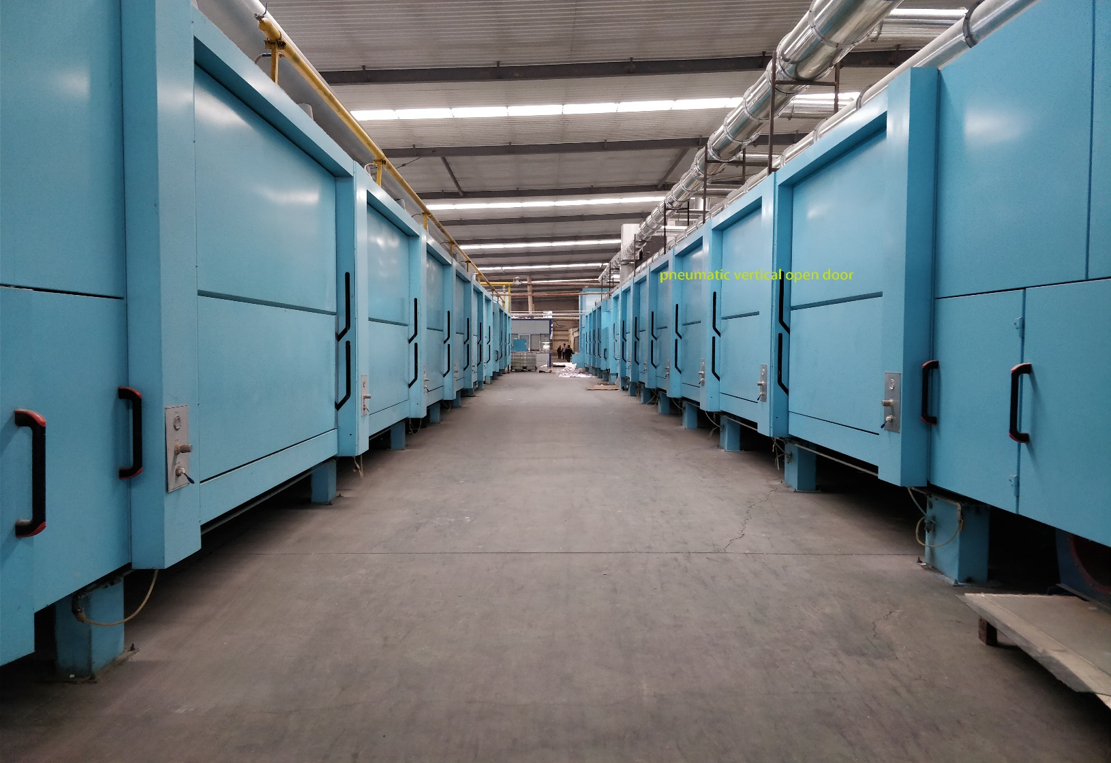 6. 2nd Heating Ovens 6.1 Main Features Each oven is equipped with 1 circulating hot air fan. Diameter at 800mm, the maximum hot air output is 18000m³/h. hot air fan is Controlled by VVVF. Honeywell Nr.1 PT100 temperature sensor to detect chamber inner temperature. All separate oven assembles with 1 temperature controller, indicating and setting oven temperature; A extra three‐way electric distributing valve make it a twice heating circuit output, avoiding over‐heating and energy wasted.
