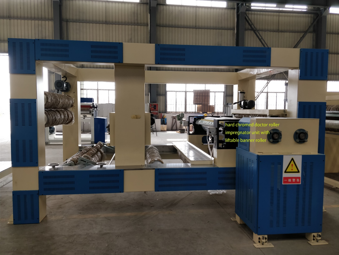 The impregnation and drying production line can be divided into a primary impregnation production line and a secondary impregnation production line. The primary impregnation production line has a relatively simple structure and high production efficiency. The same resin is used for back coating and impregnation, and the amount of glue applied is about 70%. High-pressure melamine decorative panels and base paper are generally produced in this way.